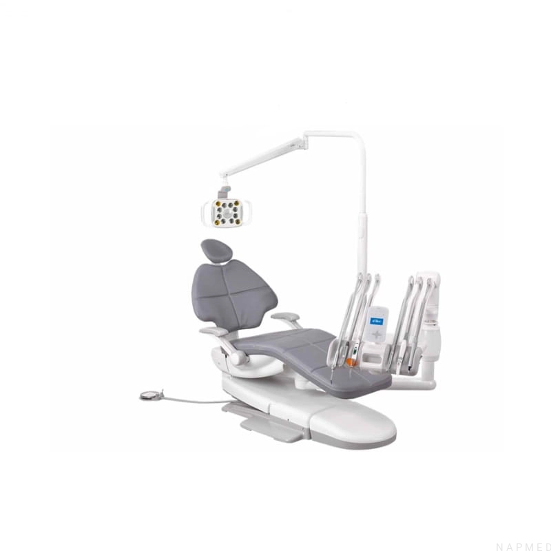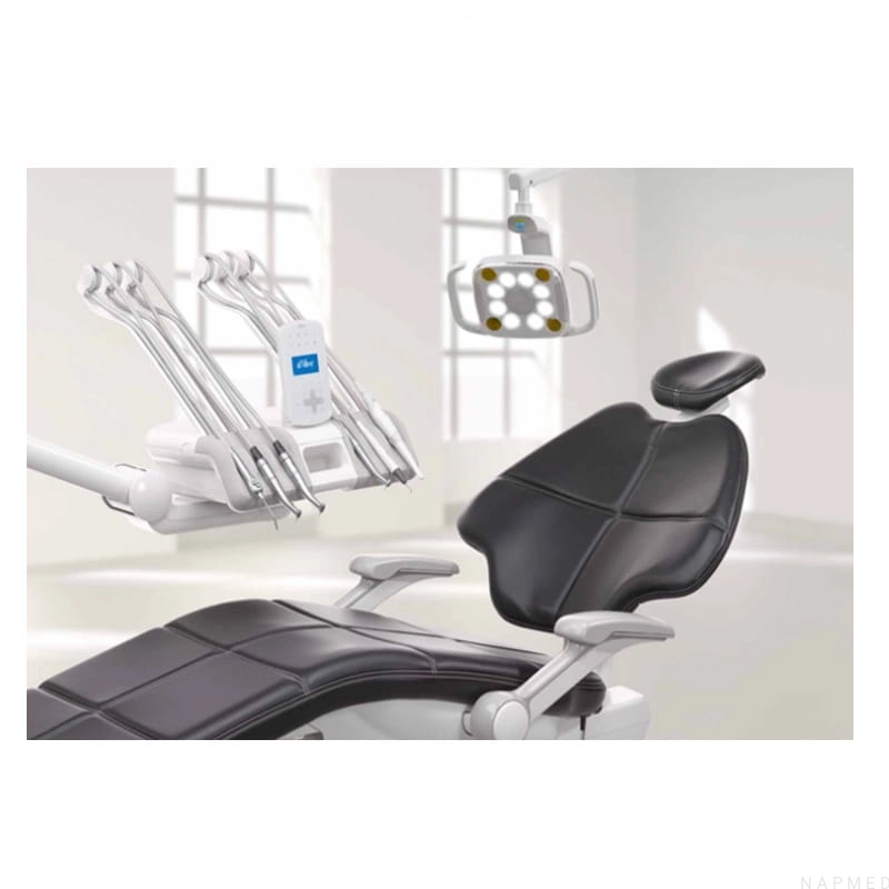 Wielodiodowa lampa zabiegowa LED mocowana do fotela z funkcją niepolimeryzującą (światło żółte), posiada możliwość ustawienia głowicy w trzech płaszczyznach, co gwarantuje centralne oświetlenie pola pracy w każdym położeniu fotela.