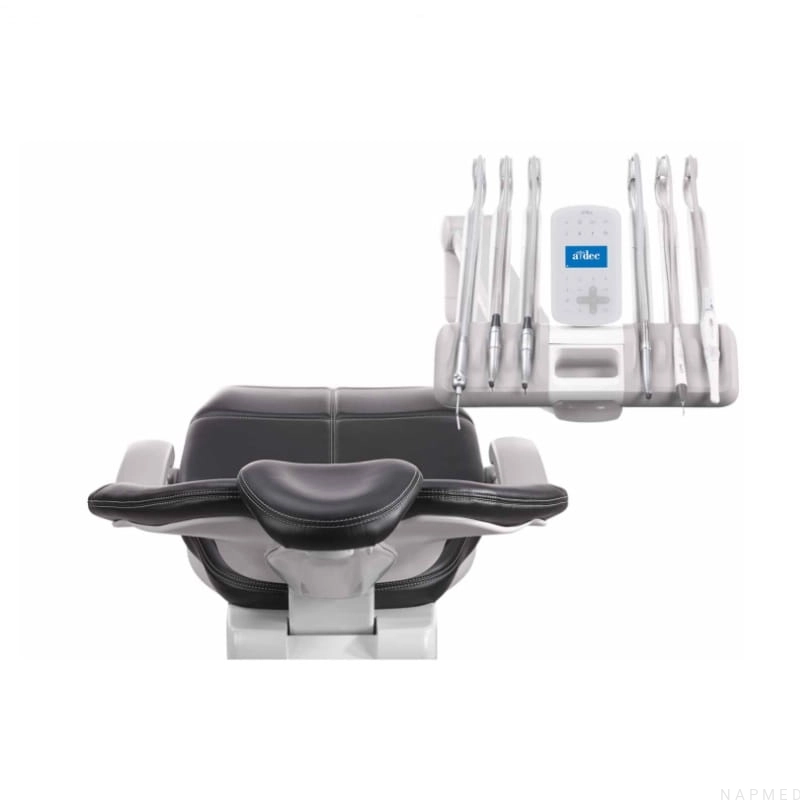 Panel sterowania Deluxe Plus umiejscowiony pośrodku pozwalający na spersonalizowanie ustawienia fotela, zmianę natężenia światła w lampie zabiegowej, spłukiwanie miski spluwaczki, napełnianie kubka pacjenta, programowanie parametrów wybranych końcówek stomatologicznych. Przystosowany do obsługi prawą lub lewą ręką.