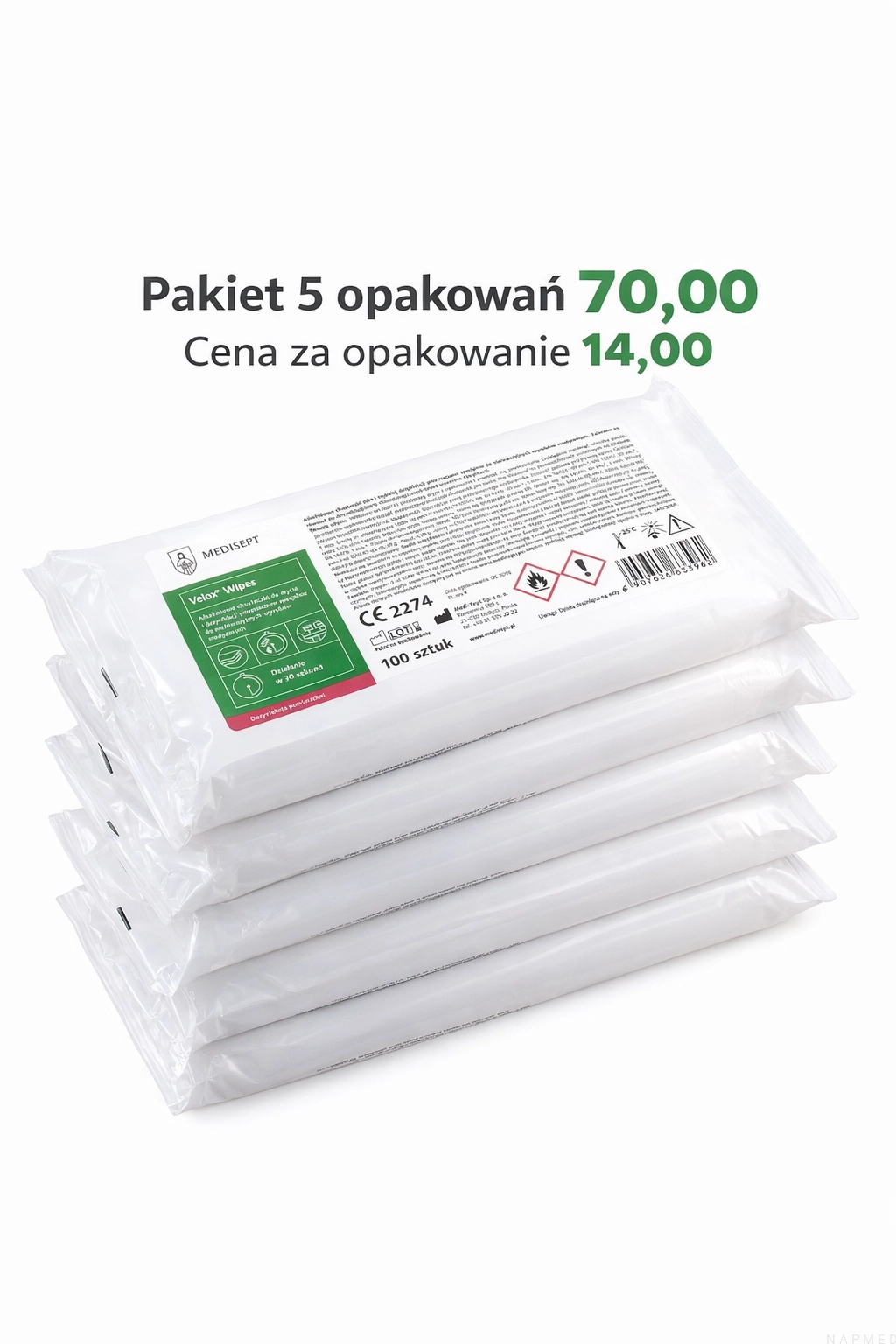 100 g roztworu dezynfekującego zawiera etanol oraz propan - 2 - ol. Opakowanie (wkład) zawiera 100 sztuk chusteczek o wymiarach 15x 19 cm.