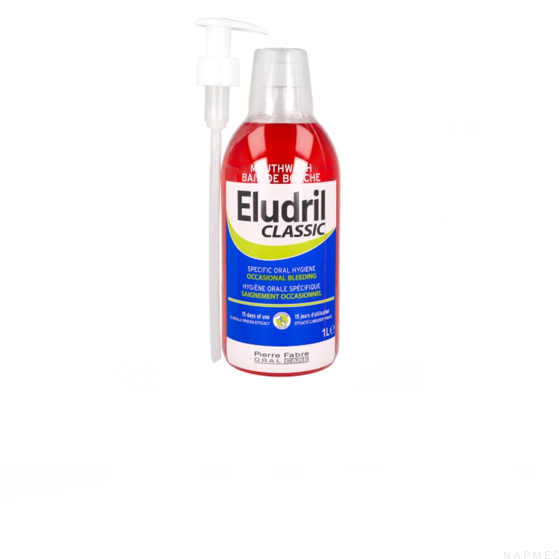 Zastosowanie: przed i po zabiegach stomatologicznych np. skaling, zabiegi higieniczne związane z utrzymaniem w czystości uzupełnień ruchomych - odkażanie protez, przy podrażnieniach dziąseł, w wyniku użytkowania uzupełnień protetycznych, jako uzupełnienie leczenia implantologicznego, jako uzupełnienie leczenia chirurgicznego, jako uzupełninie leczenia implantologicznego, przy podrażnionych i krwawiących dziąsłach. Zalety: wydajny, w formie koncentratu, zawiera CHX 0,1%, zawiera chlorobutanol w stężeniu 0,5%, o intensywnym, miętowym smaku, działanie antybakteryjne i łagodzące, dzięki połączeniu diglukonianu chlorheksydyny i chlorobutanolu, preparat wykazuje działanie ograniczające powstawanie płytki nazębnej a także łagodzi podrażnienia dziąseł, dokuzynian sodu zawarty w preparacie, umożliwia lepszą penetrację składników aktywnych, preparat pomaga w utrzymaniu prawidłowej higieny jamy ustnej, duże opakowanie z miarką i pompką, ułatwiającą prawidłowe dozowanie płynu, działa antybakteryjnie, przyspiesza gojenie tkanek, płukanka zawiera alkohol, dla optymalnej i stabilnej formuły preparatu. Opakowanie zawiera: Eludril Classic 1l + pompka Pierre Fabre.