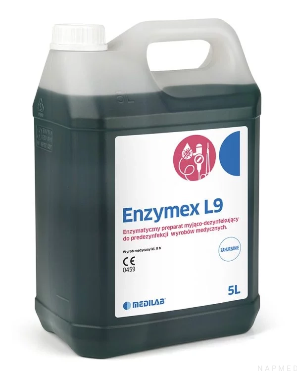 Enzymex L9 to skoncentrowany preparat, do ręcznego mycia i dezynfekcji narzędzi, endoskopów oraz innych wyrobów medycznych. Trójenzymatyczny preparat Enzymex L9, to skoncentrowana mieszanina enzymów takich jak proteaza, amylaza i lipaza, które w połączeniu z detergentami, rozpuszczają zanieczyszczenia organiczne (krew, ślinę, śluz) oraz zapobiega ich utrwalania np. zaschnięciu.