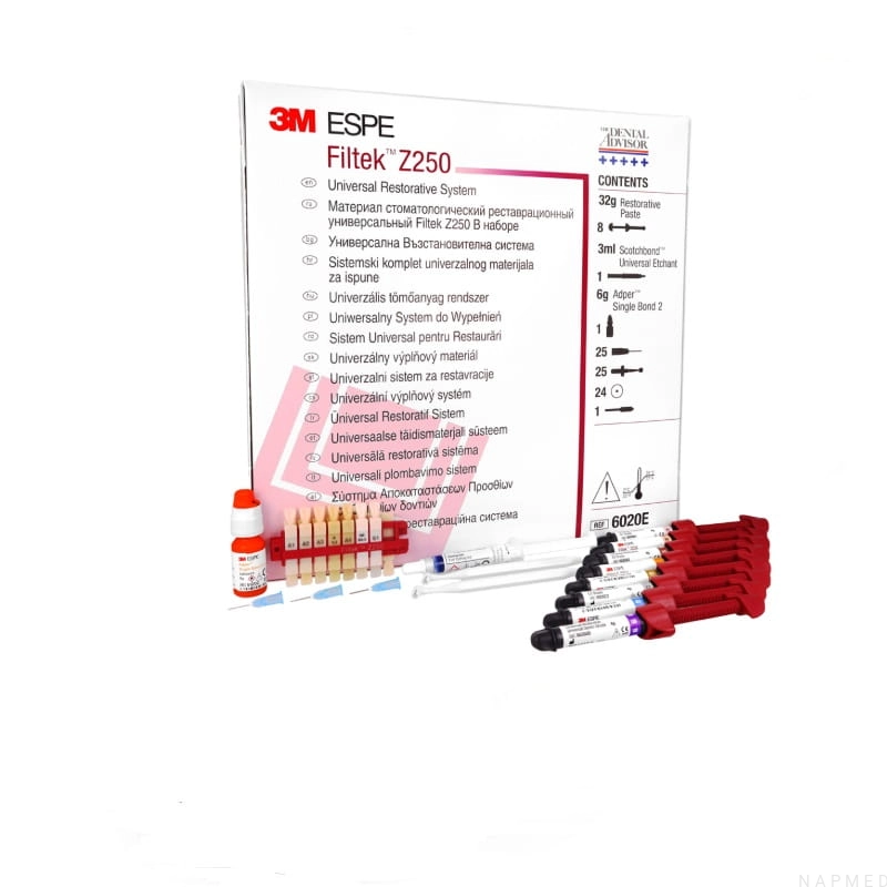 Opakowanie zawiera: Filtek Z 250 4 g x 8 szt. + Adper Single Bond 6 ml 3M + akcesoria.