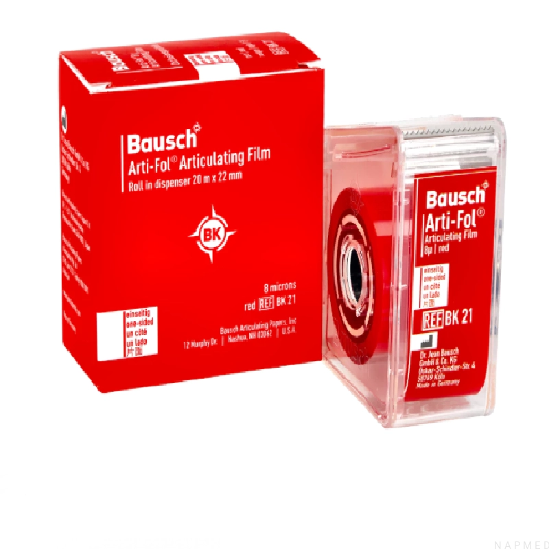 Niewielkie, przedwczesne punkty kontaktu w zakresie kilku mikronów mogą być przyczyną dyskomfortu, bólu a nawet problemów z połykaniem. Dlatego bardzo ważne stają się materiały kontrolne, które potrafią doskonale odwzorować punkty kontaktu, nawet te z niewielką średnicą, które ledwo są widoczne na wypolerowanych powierzchniach ceramicznych lub metalicznych. Kalka stomatologiczna Bauscha jest maksymalnie cienka. Składa się z pigmentu i wosku oraz komponentów hydrofilnych. Folie są wytrzymałe na rozerwanie, dobrze działają na wilgotnych powierzchniach zwarciowych, punkty kontrolne są ostre i dokładne. W pierwszym etapie stosuje się kalkę stomatologiczną w kolorze czerwonym do kontroli statycznych punktów kontaktu a następnie w kolorze czarnym ekscentryczne punkty kontaktu. Oczywiście kolejność można zmienić. Można również stosować więcej kolorów do odtwarzania antagonistcznych punktów kontaktowych ( dostępnych jest 5 kolorów ). Opakowanie zawiera 20 m jednostronnej, czerwonej folii o szerokości 22 mm.