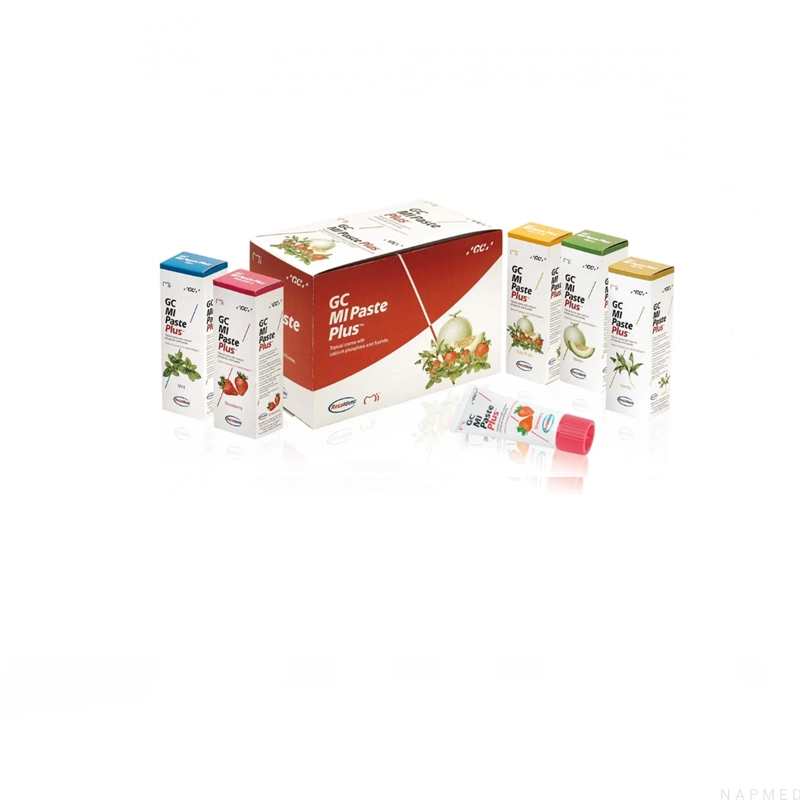 GC Mi Paste Plus to pasta powstała na bazie wody, która zawiera w składzie RECALDENTTM (CPP-ACP: fosfopeptyd kazeiny - amorficzny fosforan wapnia) z włączonym fluorem, którego zawartość wynosi 0,2% (900 ppm), co odpowiada jego średniej zawartości w pastach do zębów dla osób dorosłych. RECALDENTTM po wprowadzeniu do jamy ustnej, zaczyna gromadzić się na błonce nabytej, płytce nazębnej, bakteriach, hydroksyapatytach oraz tkance miękkiej, dostarczając bioaktywny wapń, fosforan i fluor. Mi Paste Plus: ma zdolność reminalizacji i zatrzymania próchnicy początkowej, zmniejsza nadwrażliwość, dla pacjentów noszących aparat ortodontyczny - pomaga usunąć białe plamy, dodatkowa ochrona, zwłaszcza przeciwko działaniu kwasów, dla kobiet w ciąży. Mi Paste Plus to połączenie reminalizacji i fluoryzacji zębów. Optymalizuje uwalnianie i wchłanianie fluoru do szkliwa. Pasta ma zdolność do buforowania zmian pH w płytce nazębnej, znacznie osłabia adhezję, reminalizuje ubytki w szkliwie, jednocześnie sprawiając, że zreminalizowane szkliwo jest odporniejsze na negatywne działanie kwasów. Mi Paste korzystnie wpływa na sposób transportu fluorków do szkliwa i ich wchłanianie. Dostępne smaki: melon, mięta, truskawka, tutti frutti, wanilia. Opakowanie zawiera 35 ml pasty w wybranym wariancie smakowym.