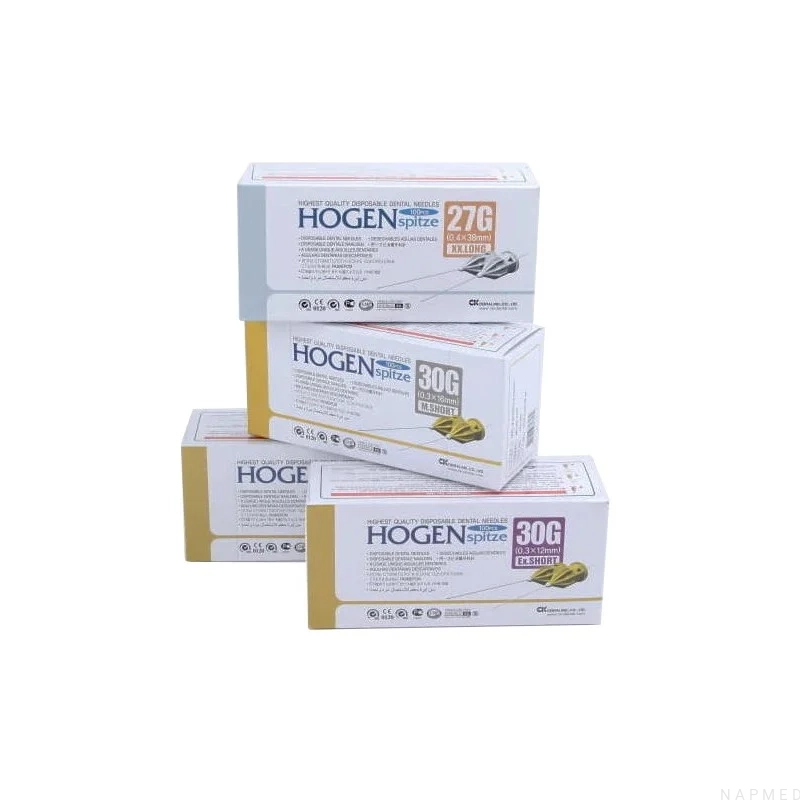 Sterylnie pakowane, jednorazowe igły do karpuli model Hogen Spitze. Igły zostały wyprodukowane z najwyższej jakości, nietoksycznej stali technicznej. Pokryte na zewnętrznej części powłoką silikonową, która redukuje ból pacjenta.