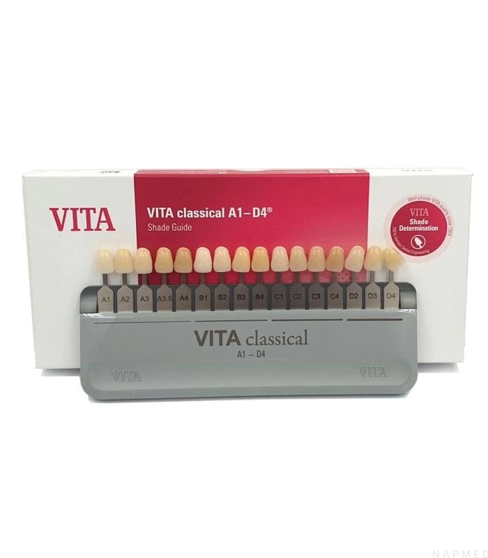 Kolornik firmy Vita w kolorach od A1 do D4 doskonale sprawdza się w praktyce stomatologicznej. Wielokrotnie testowany, aby każdy odcień był jak najbardziej podobny do przypadków odcieni zębów naturalnych.