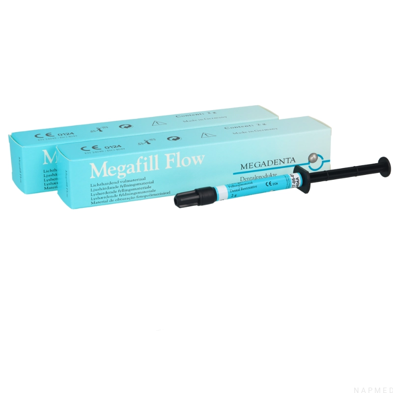 Megafill FLOW to światłoutwardzalny, płynny materiał kompozytowy, przeznaczony do stomatologii zachowawczej. Dzięki swojej płynnej konsystencji umożliwia precyzyjną i łatwą aplikację, szczególnie w trudno dostępnych miejscach. Produkt ten idealnie nadaje się do: wypełniania niewielkich ubytków i szczelin, stosowania jako pierwsza, cienka warstwa pod inne materiały kompozytowe, napraw drobnych ubytków w kompozytach, uszczelniania bruzd, odbudowy niewielkich ubytków w zębach mlecznych.