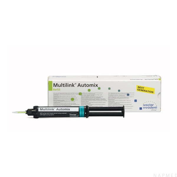Multilink Automix strzykawka to samopolimeryzujący adhezyjny cement kompozytowy o podwójnym mechanizmie polimeryzacji wykorzystywany w sytuacji kiedy wymagana jest siła łączenia o dużej wartości, podczas ostatecznego cementowania uzupełnień protetycznych takich jak: wkłady, nakłady, korony, mosty, mosty adhezyjne, wkłady koronowo-korzeniowe.