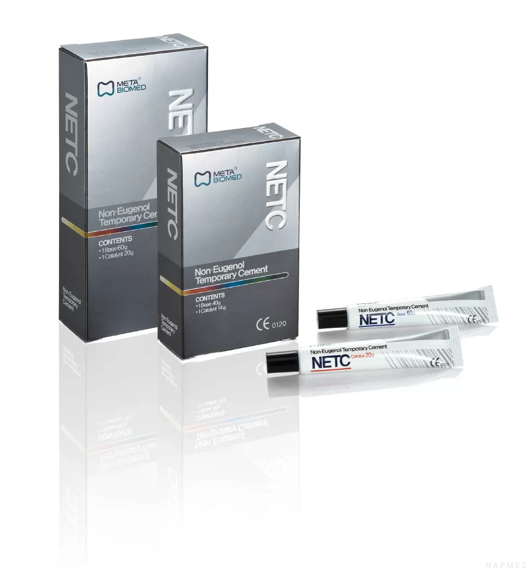 Cement NETC jest materiałem tymczasowym stosowanym w procedurze osadzania koron i mostów. Brak zawartości eugenolu w składzie cementu wpływa korzystnie na cementowanie prac na żywych zębach ryzyko wystąpienia ich nadwrażliwości. Materiał tymczasowy NETC do cementowania jest zalecany również w przypadku pacjentów uczulonych na materiały, w których składzie obecny jest eugenol. Opakowanie zawiera 50g bazy oraz 14g katalizatora.