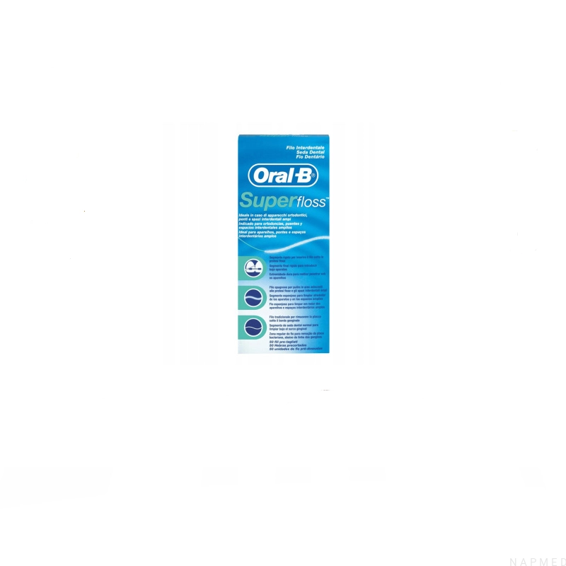 Nić dentystyczna Super Floss ORAL-B nadaje się idealnie do czyszczenia aparatów ortodontycznych, mostów oraz większych przestrzeni międzyzębowych. Opakowanie zawiera 50 odmierzonych odcinków nici z trzema elementami: usztywniona końcówka, nić miękka, nić standardowa.