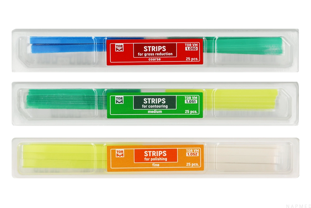 Paski ściernych od firmy TOR VM to nieodzowne narzędzia w codziennej praktyce stomatologicznej. Ich funkcjonalność obejmuje polerowanie wypełnień kompozytowych oraz usuwanie przebarwień i kamienia nazębnego z przestrzeni międzyzębowych. Kodowanie kolorystyczne ułatwia szybkie dobieranie odpowiedniej granulacji, co przekłada się na precyzyjne wybieranie właściwego rodzaju paska.