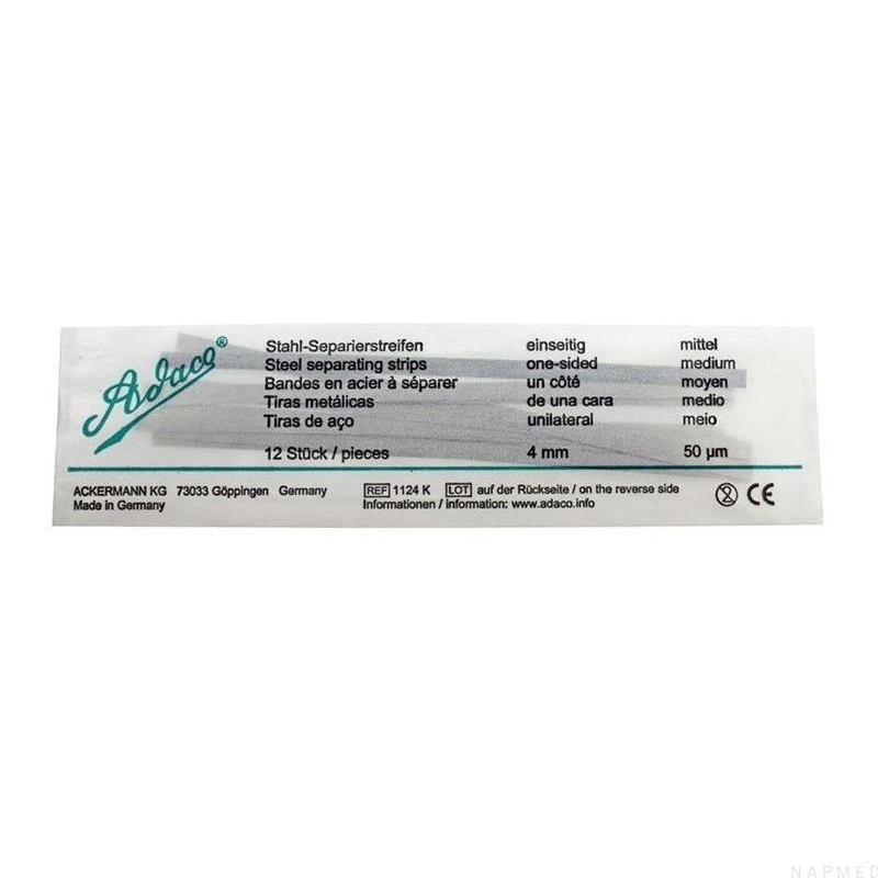 Paski ścierne ze stali jednostronne. Przeznaczone do opracowywania i polerowania wypełnień stomatologicznych. Paski doskonale nadają się do ręcznego przygotowania przestrzeni międzyzębowej, trudno dostępnej dla innych narzędzi. Paski ścierne z nasypem diamentowym (50 mikronów). Długość paska 14cm.