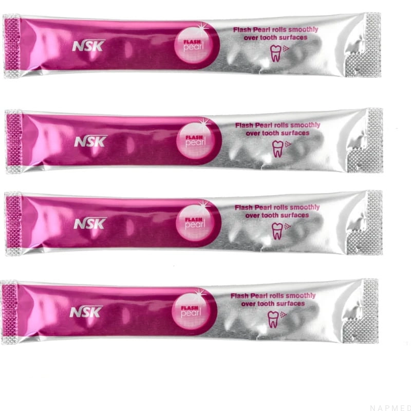 Piasek Flash Pearl firmy NSK pozwala na delikatne i wysoce skuteczne czyszczenie zębów. Kulisty kształt cząsteczek proszku, o średniej wielkości 54 µm, powstałych na bazie wapnia, zapewnia bezpieczne usuwanie osadów, przebarwień i płytki nazębnej, pozostając jednocześnie bezpiecznym dla tkanek miękkich i zębów. Ponadto wapń nie tworzy zbitej masy, która mogłaby zapchać dyszę.