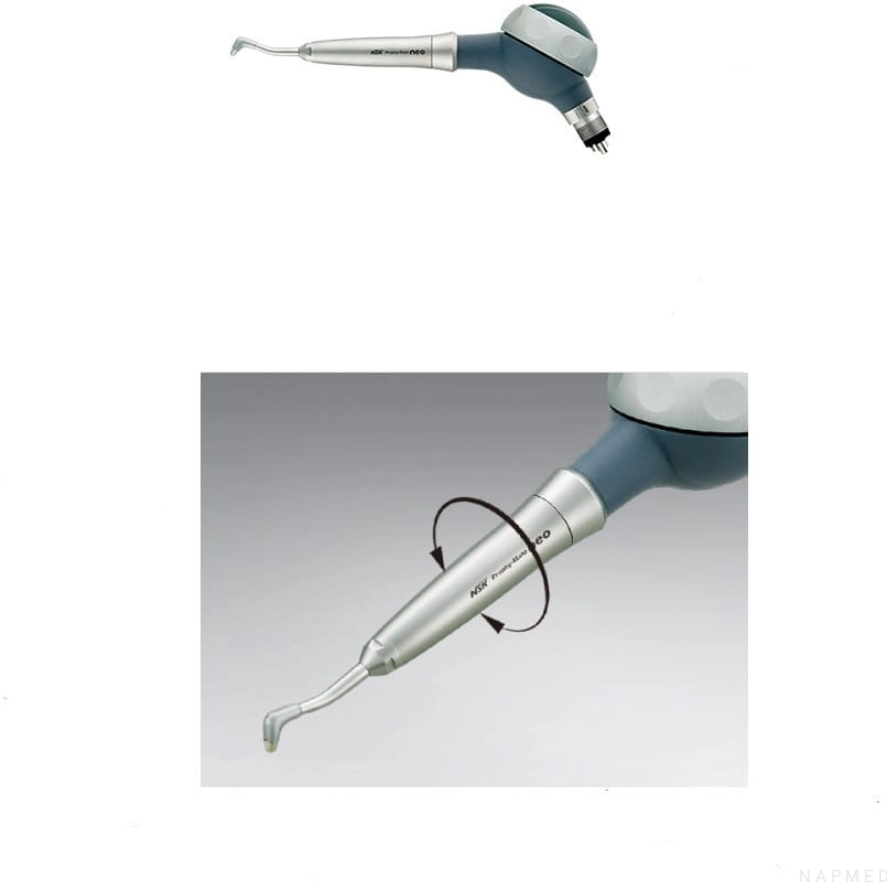 Prophy-Mate neo została zaprojektowana do montażu jednym dotknięciem na szybkozłączkach NSK i innych wiodących producentów. Rękojeść można również przymocować do pojemnika na proszek jednym dotknięciem.