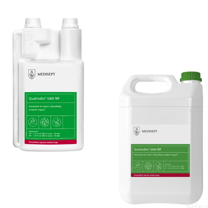 Quatrodes Unit to produkt wysokiej klasy przeznaczony zarówno do mycia jak i dezynfekcji systemów ssących, separatorów amalgamatu oraz misek unitu stomatologicznego. Jeśli produkt jest stosowany regularnie, zapobiega powstawaniu biofilmu. Quatrodes nie pieni się oraz może być używany do dezynfekcji wanien z hydromasażem. Wyrób przeznaczony jest do użytku profesjonalnego.