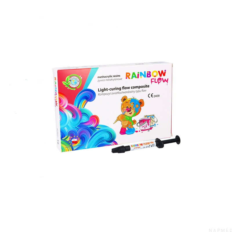 Zalety: zaprojektowany z myślą o dzieciach, dostępny w 6 żywych, wesołych kolorach, niski skurcz polimeryzacyjny, wysoka wytrzymałość, zadowolenie najmłodszych pacjentów Kolory: fioletowy, zielony, żółty, pomarańczowy, różowy, niebieski Skład: żywice metakrylowe (bis - GMA, UDMA ,TGDMA), wypełniacz nieorganiczny, pigmenty, fotoinicjator, inhibitor Sposób użycia: Przed przystąpieniem do zabiegu dołączony aplikator zanurzyć w spirytusie (alkohol etylowy), a następnie umieścić na strzykawce, Wypełnianie ubytków, lakowanie bruzd: opracowany ubytek/bruzdę należy wytrawić, wypłukać i osuszyć, użyć systemu wiążącego typu bond, wypełnić ubytek warstwą kompozytu o grubości ok. 2 mm, utwardzać lampą polimeryzacyjną przez 10 -15 sekund, w razie potrzeby nałożyć kolejną warstwę materiału i ponownie utwardzać Opakowanie zawiera: Rainbow Flow 1 g Cerkamed w wybranym, dostępnym kolorze.