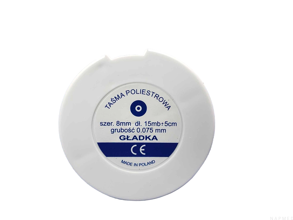 Taśma poliestrowa gładka służy do kształtowania i opracowywania wypełnień. Taśma poliestrowa gładka, przeznaczona jest do kształtowania wypełnień, przy użyciu materiałów światłoutwardzalnych. Dzięki odpowiedniej gładkości, materiał nie przywiera do taśmy. Taśma została umieszczona w ekonomicznym i wygodnym w użyciu plastikowym pojemniku wyposażonym w nożyk. Ułatwia to docięcie taśmy na odpowiednią, żądaną długość bez niepotrzebnego użycia dodatkowych narzędzi.