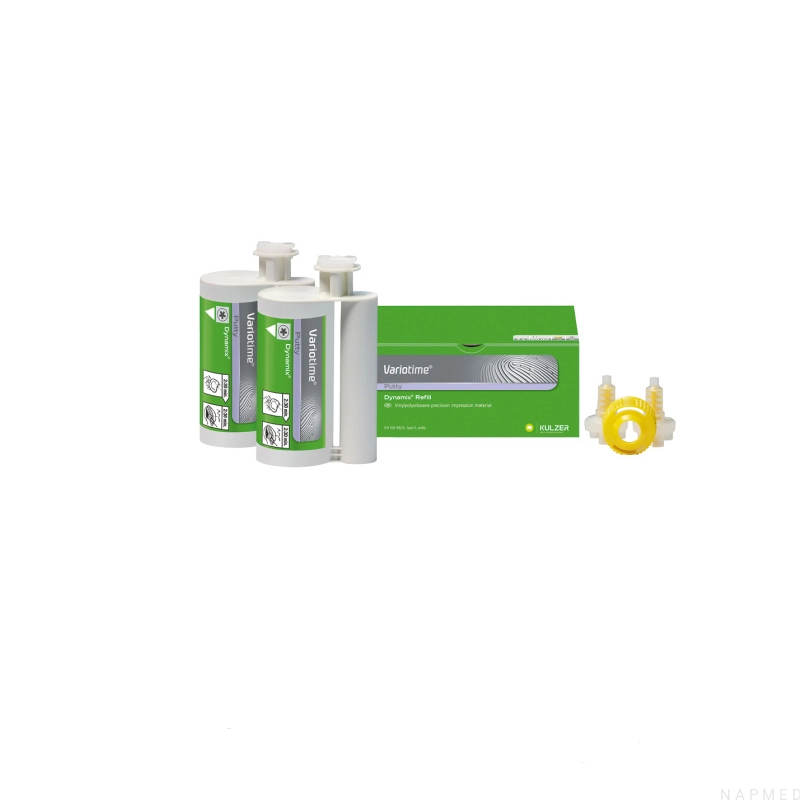 Wskazania: korony i mosty; wyciski czynnościowe; wkłady i nakłady.; wyciski transferowe i do implantów. Dostępne opakowania: Variotime Dynamix Putty 2 × 380 ml + 2 końcówki mieszające Dynamix + pierścień mocujący.