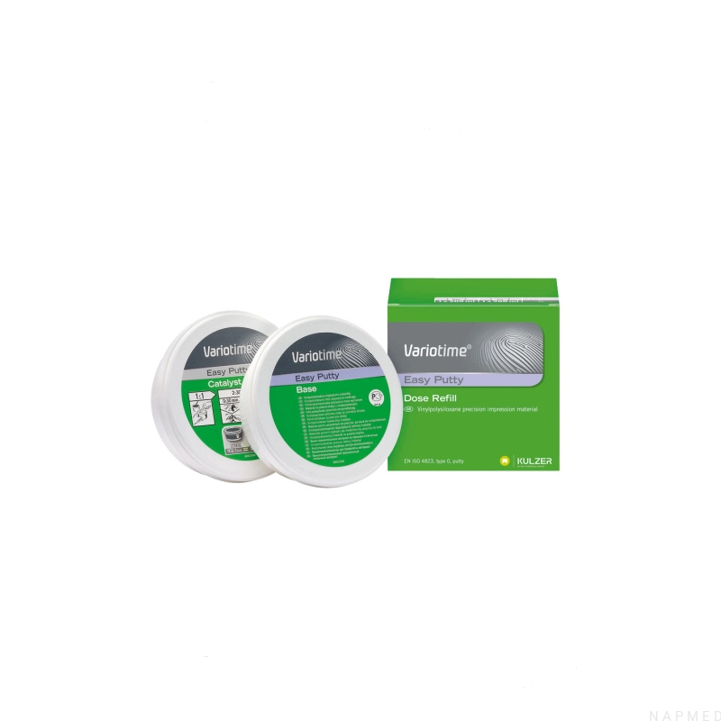nnowacyjny A-silikon, do mieszania ręcznego, który gwarantuje wspaniałe rezultaty oraz ujednolicone procedury pracy. Łączy w sobie doskonałą precyzję z możliwością dostosowania do techniki opracowania co umożliwia tworzenie wycisków będących podstawą precyzyjnie dopasowanych uzupełnień protetycznych. Koncepcja zmiennego czasu zapewnia większe możliwości przy doborze rozpoczęcia czasu wiązania, co umożliwia większą swobodę pracy, zmniejszając presję dla lekarza i zapewniając większy komfort pacjenta. Używając masy Variotime, uzyskamy precyzyjne odtworzenie detali dzięki dokładności wymiarowej oraz doskonałym właściwościom hydrofilowym. Miękka konsystencja w trakcie mieszania sprawia, że masa jest łatwa i szybka w użyciu. Opakowanie 2 × 300 ml (baza + katalizator).