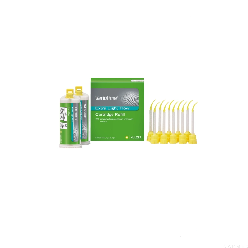 Masa stosowana jako druga warstwa podczas wycisków z użyciem systemu Variotime. Materiał o bardzo małej spójności, odporny na wilgoć. Ma najlepsze właściwości hydrofilowe (na poziomie polieteru), które powodują idealne zachowanie w kieszonkach i bruzdach. Duża elastyczność i wytrzymałość na uszkodzenia. Szczególnie polecana do wycisków dwuczasowych. Opakowanie: nabój z automatycznym mieszaniem 2 × 50 ml + końcówki mieszające 10 szt.
