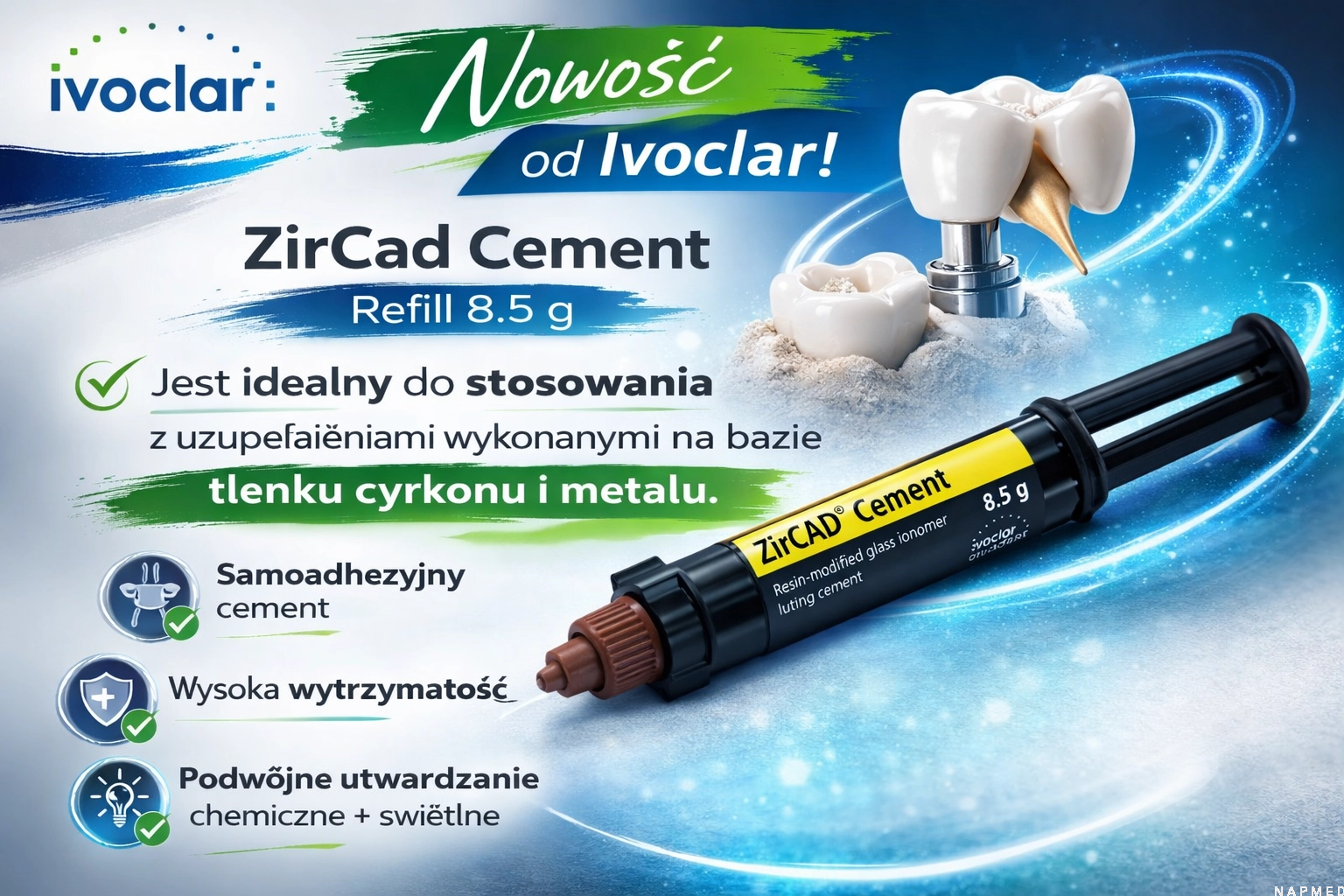 - Najprostszy sposób na cementowanie uzupełnień wykonanych z tlenku cyrkonu i na podbudowie z metalu.
